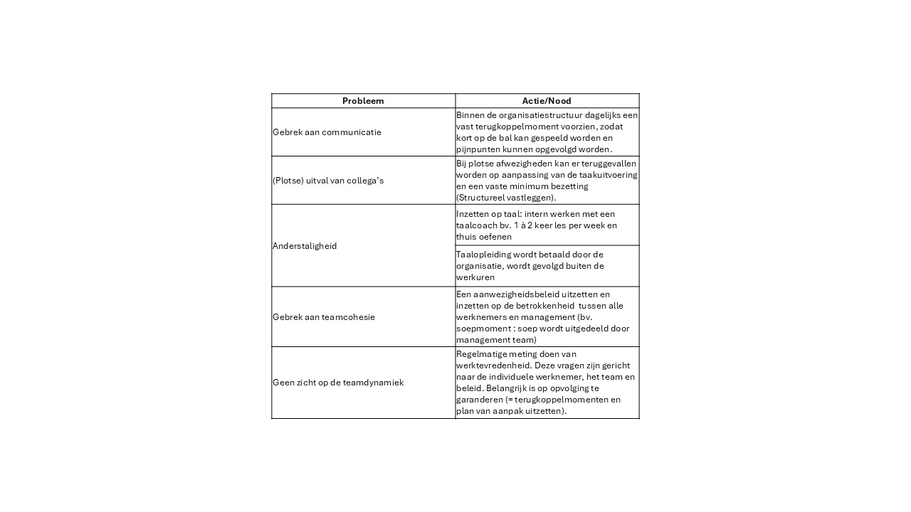 | Gebrek aan communicatie | Binnen de organisatiestructuur dagelijks een vast terugkoppelmoment voorzien, zodat kort op de bal kan gespeeld worden en pijnpunten kunnen opgevolgd worden. |